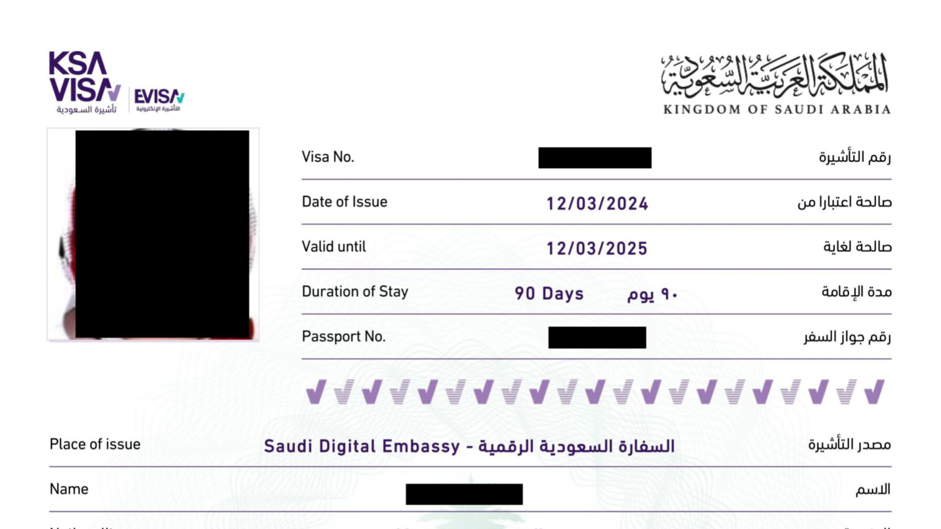 ثانياً: صلاحية التأشيرة، وهي تشير إلى الإطار الزمني الكلي الذي يمكن خلاله استخدام التأشيرة من أجل الدخول إلى السعودية. انتهاء هذه الصلاحية يعني انتهاء الحق في الدخول إلى المملكة باستخدام تلك التأشيرة، حتى لو لم يتم استخدام كامل أيام الإقامة المسموح بها.