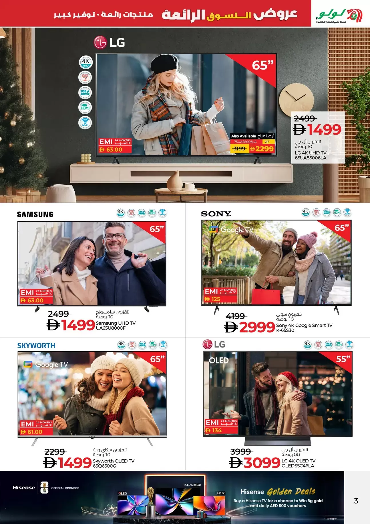 - شاشة LG 4K UHD 65 بوصة: متوفرة بسعر 1,499 ريال/درهم فقط (الوزن المثالي بين السعر والجودة).