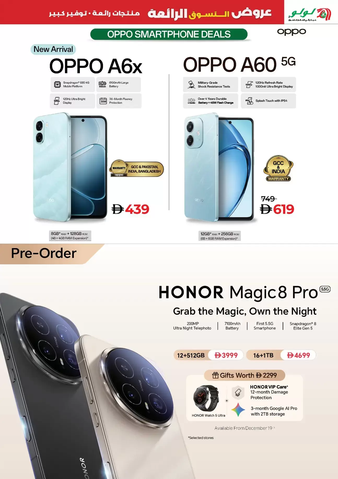 - هاتف HONOR Magic8 Pro 5G (طلب مسبق): متاح الآن بسعر يبدأ من 3,999 ريال/درهم لنسخة (12+512GB)، مع هدايا قيمة تصل قيمتها إلى 2,299 تشمل ساعة HONOR Watch 5 Ultra وحماية للشاشة.