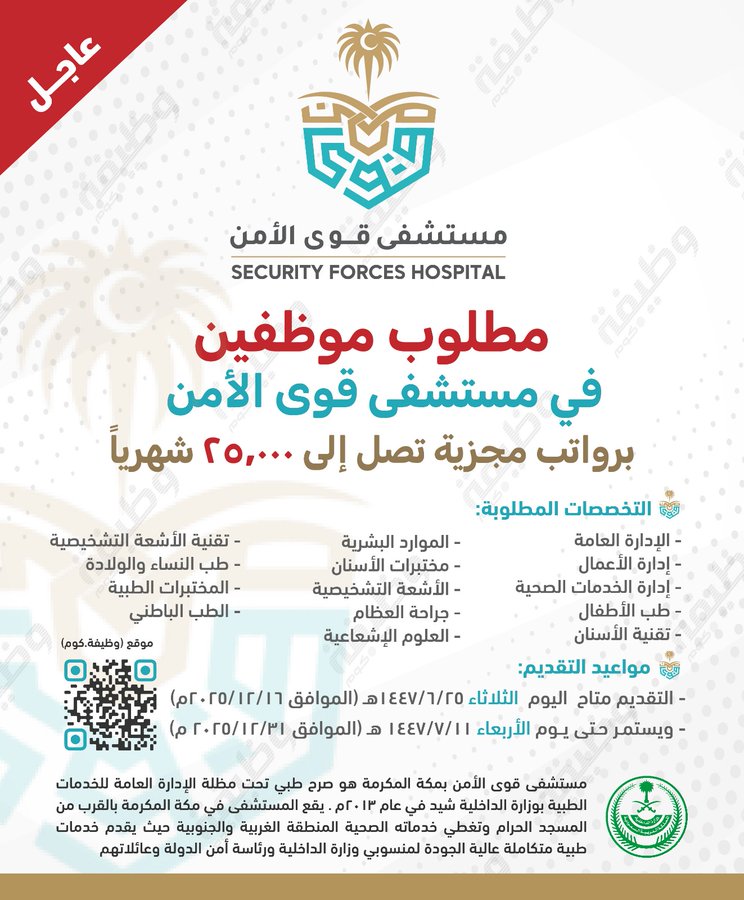 لا تدع هذه الفرصة تفوتك للانضمام إلى واحد من أعرق الصروح الطبية في المملكة. إن الجمع بين الراتب المجزي الذي يصل لـ 25,400 ريال والبيئة المهنية الراقية يجعل من العمل في مستشفى قوى الأمن خطوة استراتيجية في مسيرتك العملية.