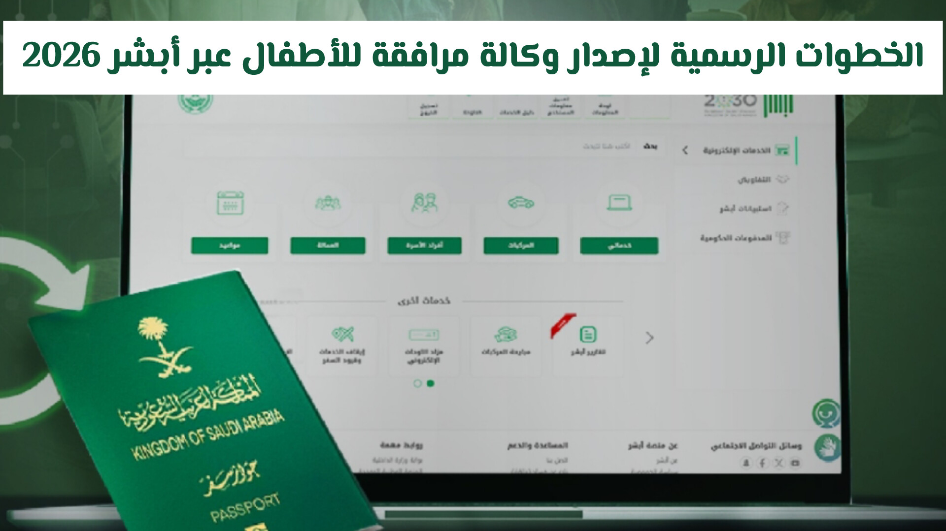توفر منصة أبشر خدمات إلكترونية متكاملة تسهّل على الأسر السعودية إصدار تصاريح السفر لأفراد الأسرة وإصدار الوكالات الشرعية للأطفال القصر بسهولة تامة، دون الحاجة لمراجعة المكاتب الحكومية . يمكن للمستفيدين التحكم في إصدار أو إلغاء تصاريح السفر للأبناء غير المتزوجين الذين لم يتجاوزوا سن الـ 21 عامًا إلكترونيًا، وكذلك إصدار وكالة شرعية رسمية للأطفال دون سن 18 عامًا عند السفر غتاقل بناء على ما تم الاعلان عنه رسميا من الجهات المختصة .