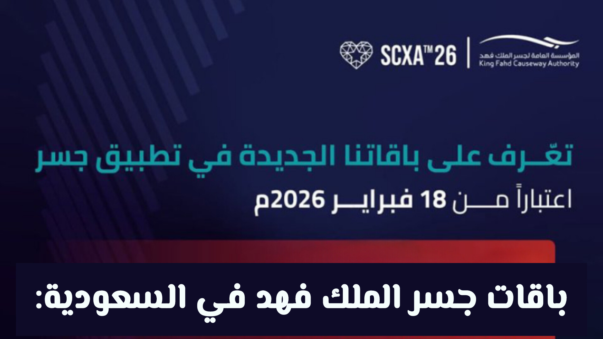 أعلنت المؤسسة العامة لجسر الملك فهد عن إطلاق باقات جسر الملك فهد 2026 الجديدة، والتي تقدم مزايا كبيرة للمسافرين بين المملكة العربية السعودية ومملكة البحرين، مع تخفيضات تصل إلى 40% على رسوم العبور . وتتيح الباقات الجديدة خيارات متعددة تناسب مختلف الاحتياجات، عبر تطبيق "جسر" الإلكتروني، بدءًا من 18 فبراير 2026 فخرضج بناء على ما تم الاعلان عنه رسميا من الجهات المختصة .