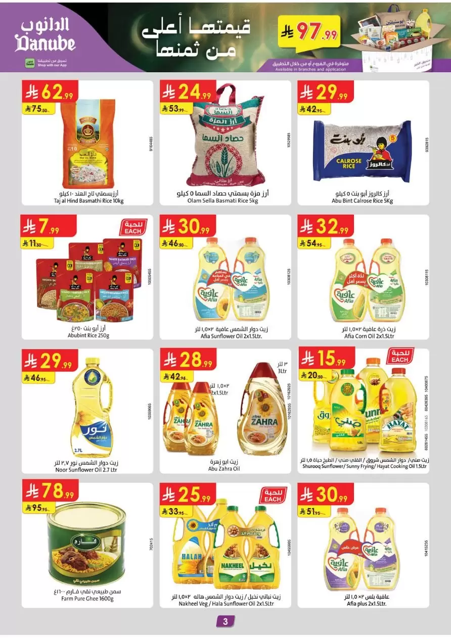 - أرز تيلدا بسمتي (5 كيلو): بسعر 49.99 ريال (توفير كبير من أصل 65.95 ريال).