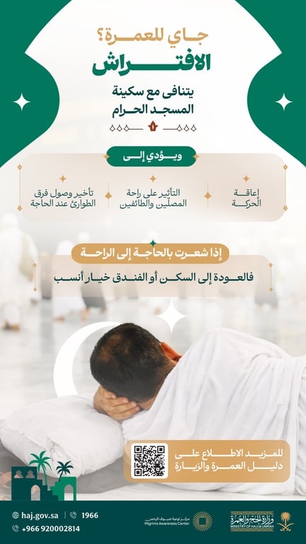 وفي إطار حرصها على راحة القاصدين، نصحت وزارة الحج والعمرة السعودية كل من يشعر بالحاجة إلى الراحة أو النوم بالتوجه إلى مقر إقامته أو الفندق الذي يسكن فيه، باعتبار ذلك الخيار الأنسب صحيًا وتنظيميًا. فالبقاء في أماكن مخصصة للسكن يضمن الراحة الشخصية، ويُسهم في تخفيف الضغط داخل المسجد الحرام وساحاته.