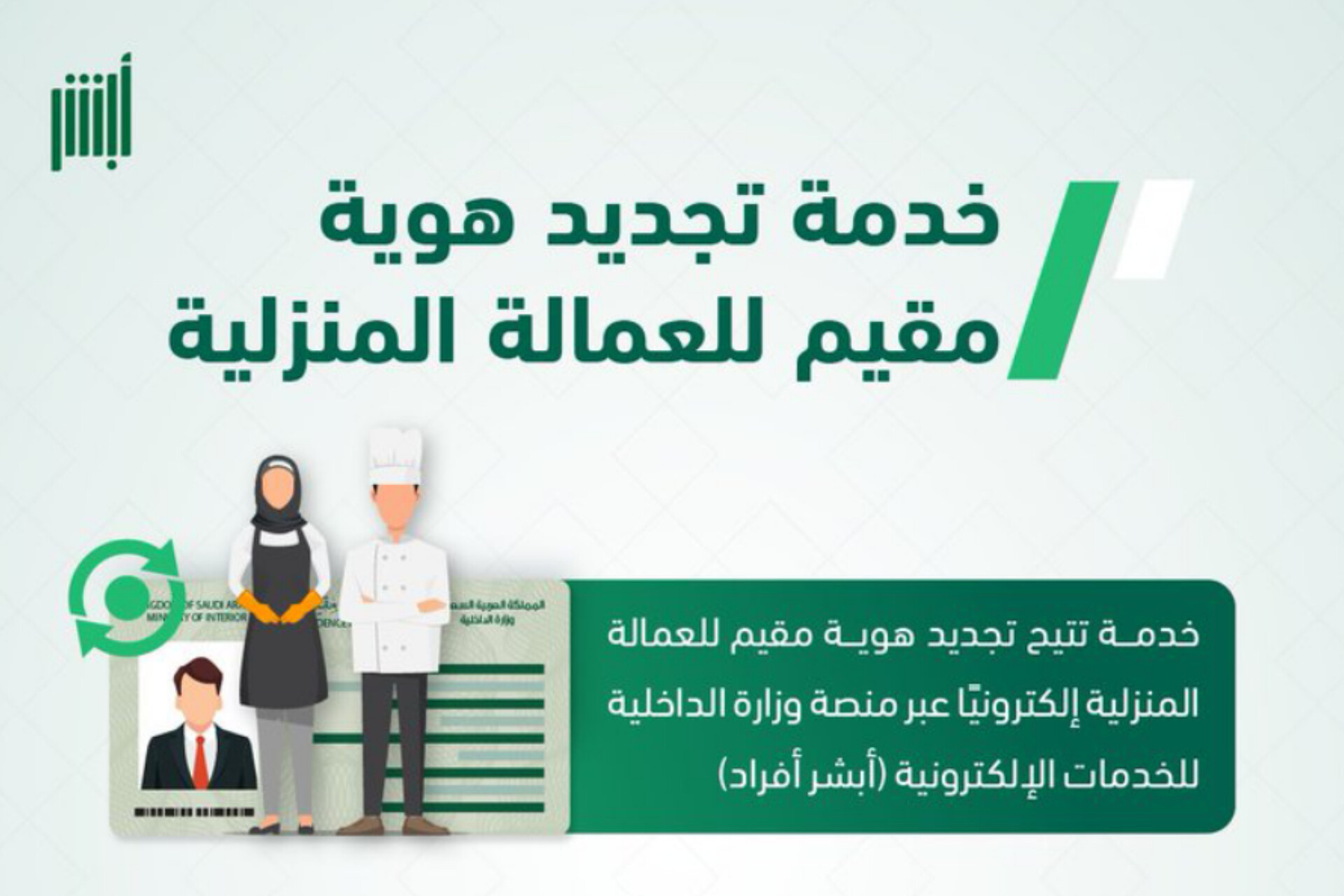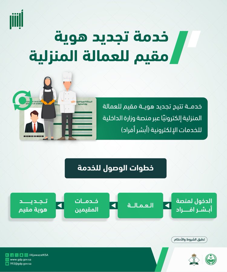 | تجديد هوية مقيم | منصة أبشر (أفراد) | العمالة المنزلية (سائق، خادمة، الخ) |