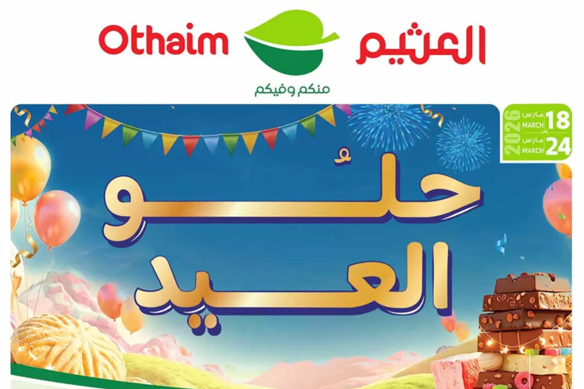 مع اقتراب الأيام المباركة وحلول عيد الفطر السعيد، أطلقت أسواق العثيم في السعودية مهرجانها السنوي الأضخم تحت شعار "حلو وعيد"، موفرةً تشكيلة هائلة من الحلويات، الشوكولاتة، والمقرمشات بأسعار تنافسية لا تقبل المنافسة. تبدأ هذه العروض من الأربعاء 18 مارس وحتى الثلاثاء 24 مارس 2026م.