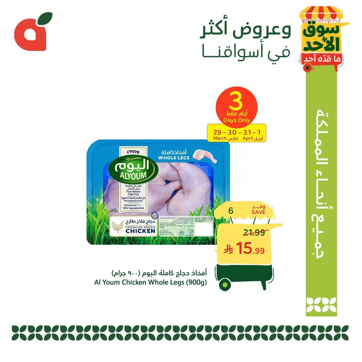 لمحبي الدجاج، يقدم سوق الأحد عرضاً خاصاً على دجاج اليوم الفاخر، حيث تتوفر الأفخاذ الكاملة بالمواصفات التالية: