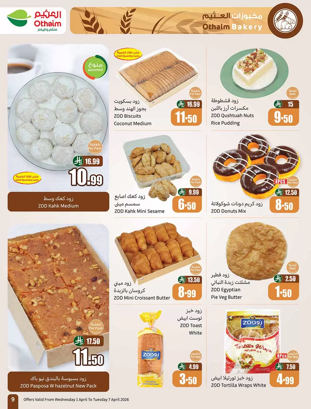 - المخبوزات (ZOD): كعك سمسم ميني بسعر 6.50 ريال، وبسبوسة بالبندق "نيو باك" بسعر 11.50 ريال.