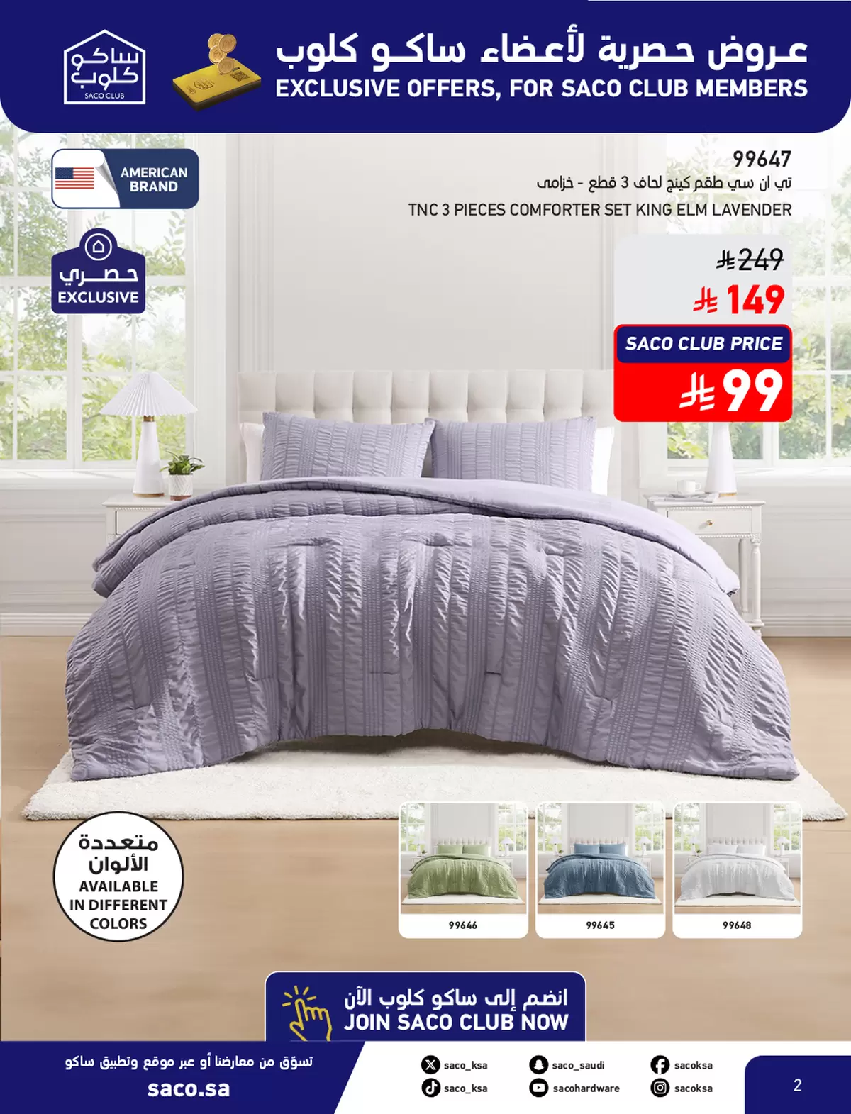 - مفروشات غرف النوم: طقم لحاف كينج (3 قطع) بألوان هادئة مثل الخزامي بسعر 99 ريال فقط.