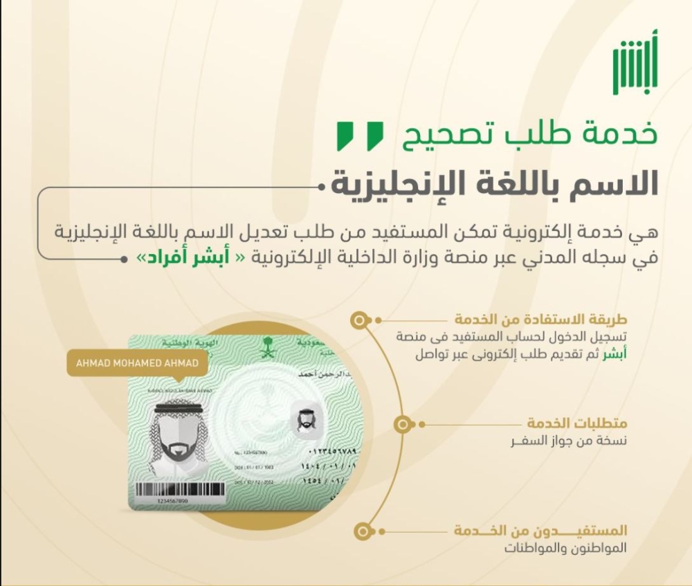 كثيراً ما يحتاج المواطنون والمواطنات إلى مطابقة بياناتهم المحلية مع الوثائق الدولية. تتيح لك وزارة الداخلية الآن تصحيح الاسم بالإنجليزية إلكترونياً عبر "أبشر أفراد" دون عناء مراجعة مكاتب الأحوال المدنية.