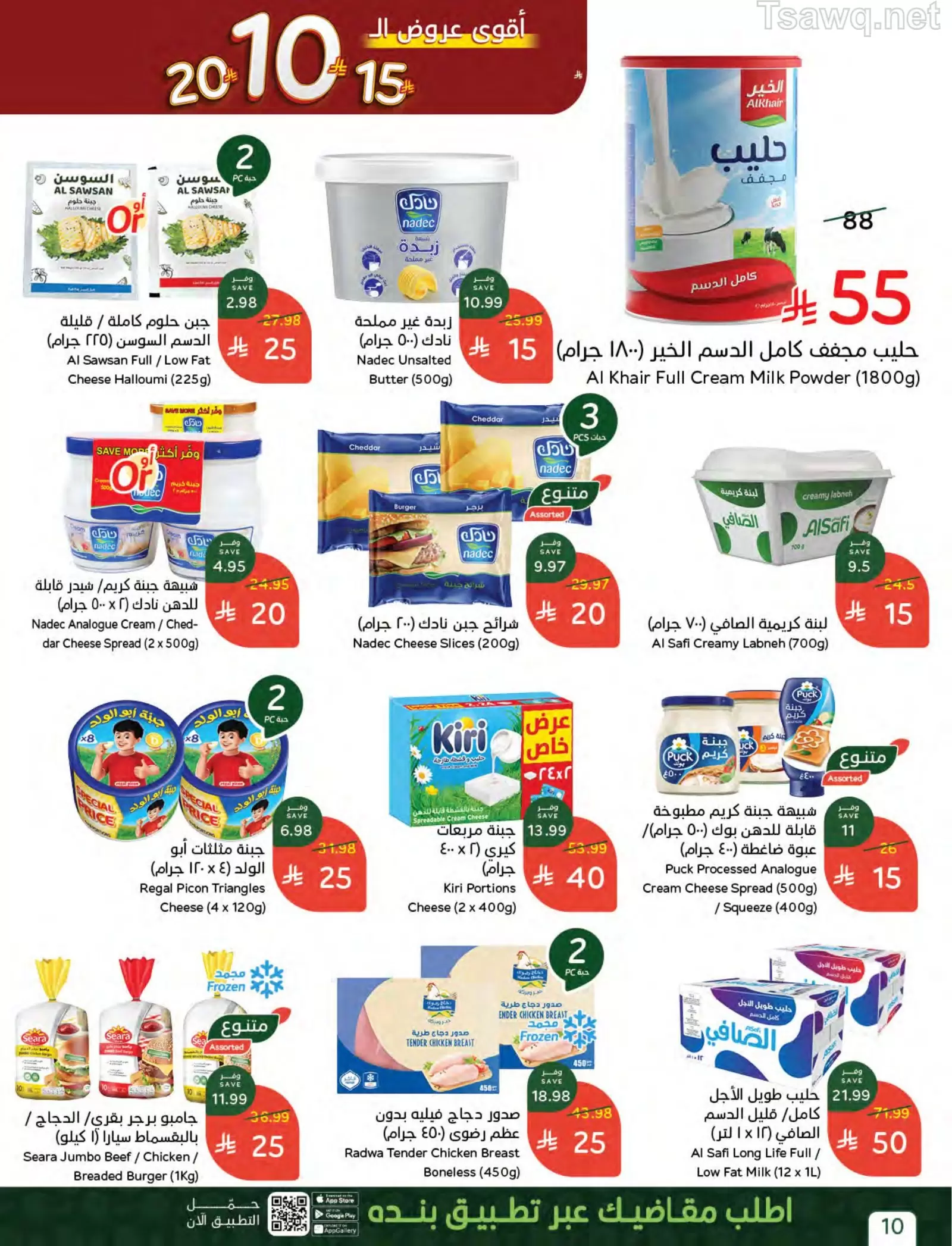- منتجات الألبان: شبيهة قشطة بوك (4 حبات) بـ 10 ريالات، ولبنة الصافي (700 جرام) بـ 15 ريالاً.