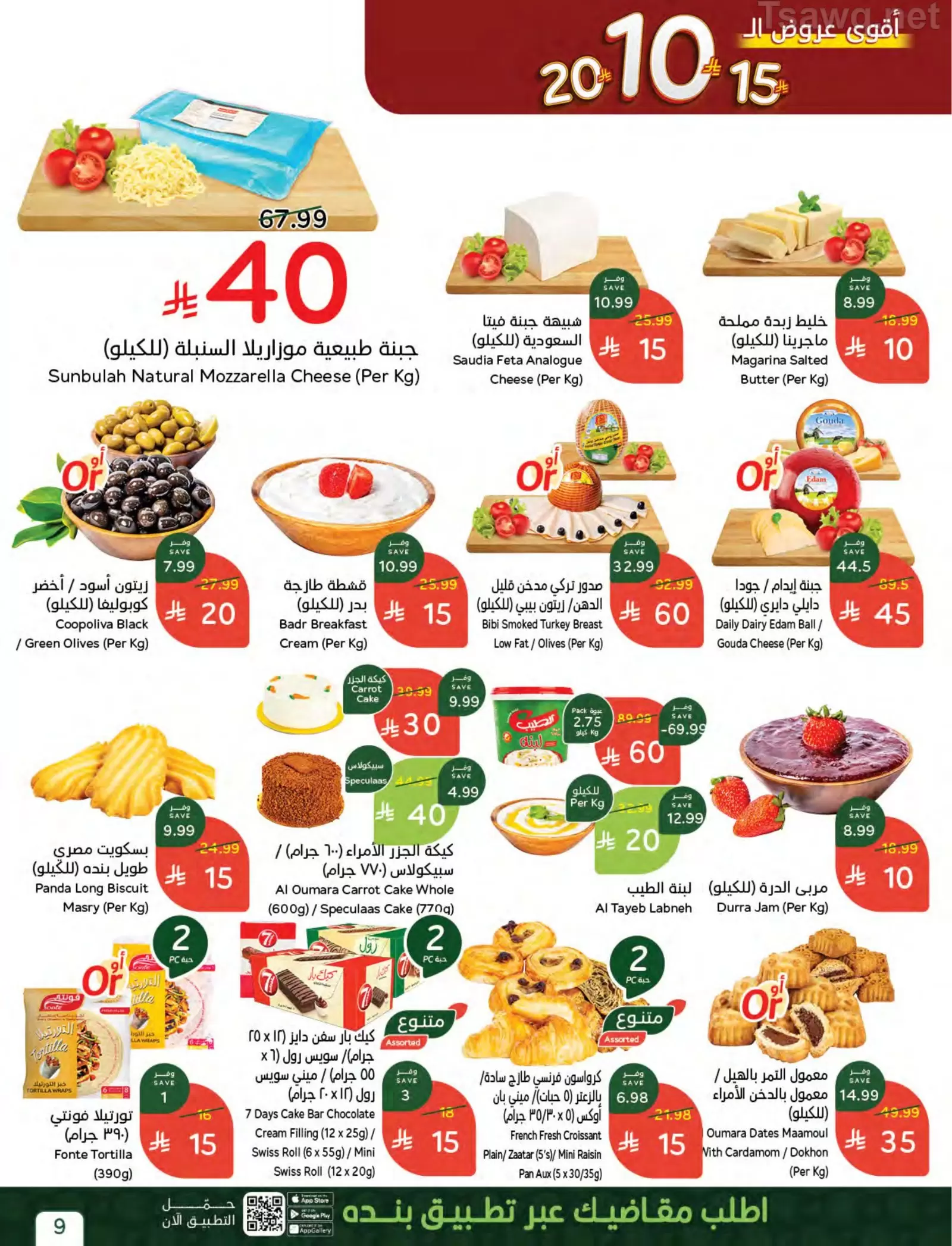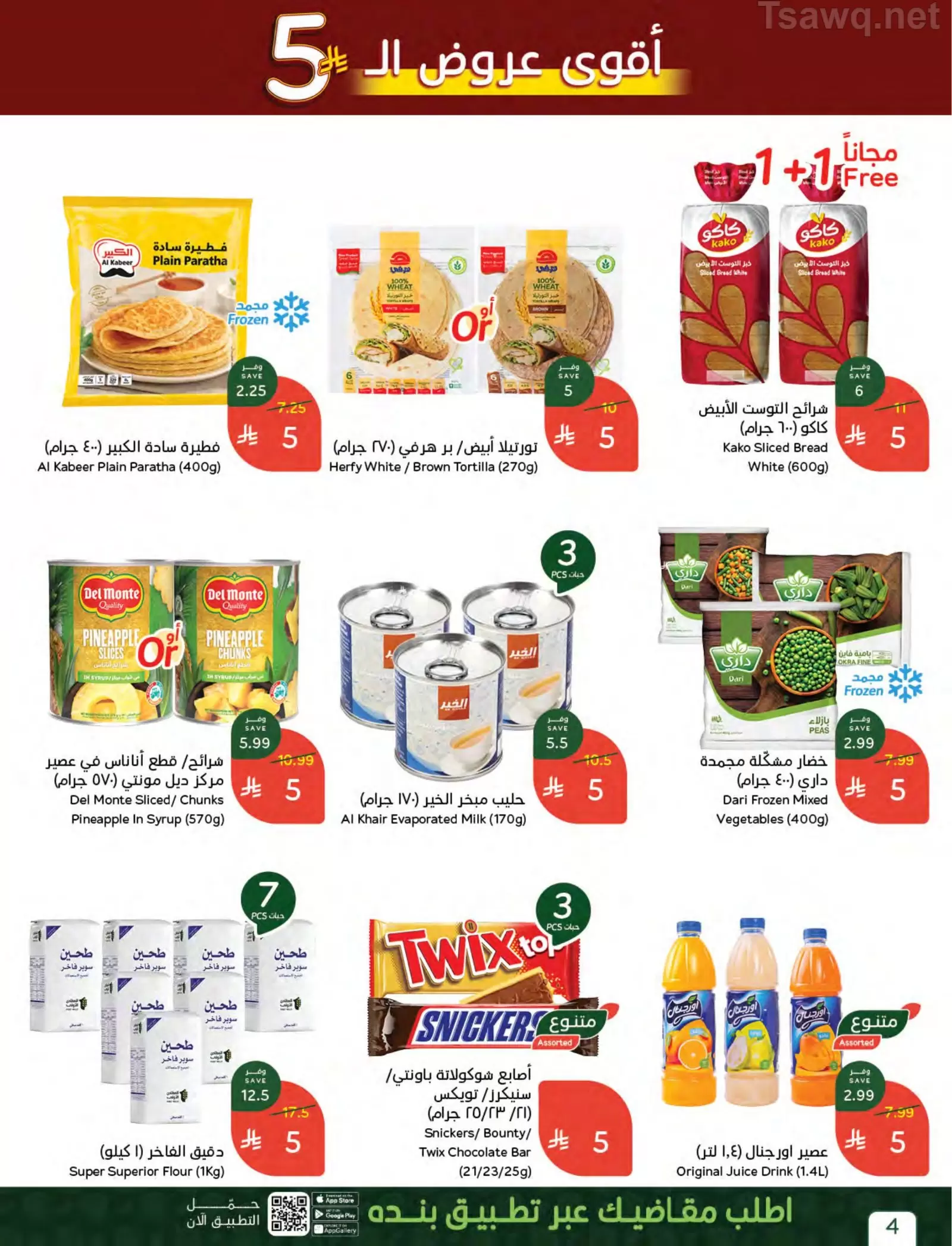 - المخبوزات: خبز توست أبيض كاكاو (1+1 مجاناً) وفطيرة سادة الكبير بسعر 5 ريالات.