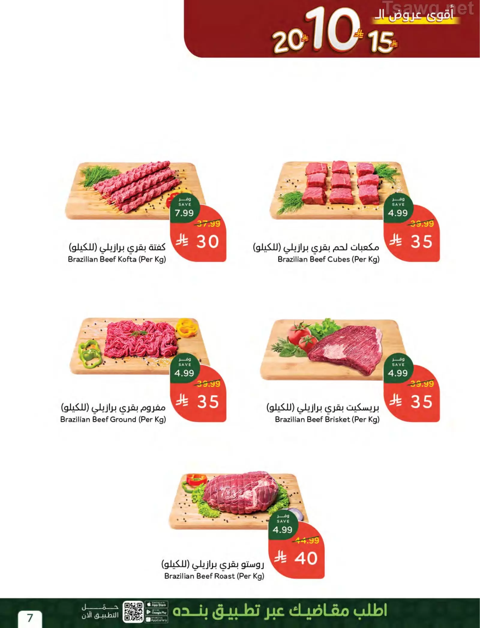 - لحم بقري برازيلي: مفروم، مكعبات، أو كفتة بأسعار تتراوح بين 30 إلى 35 ريالاً للكيلو.