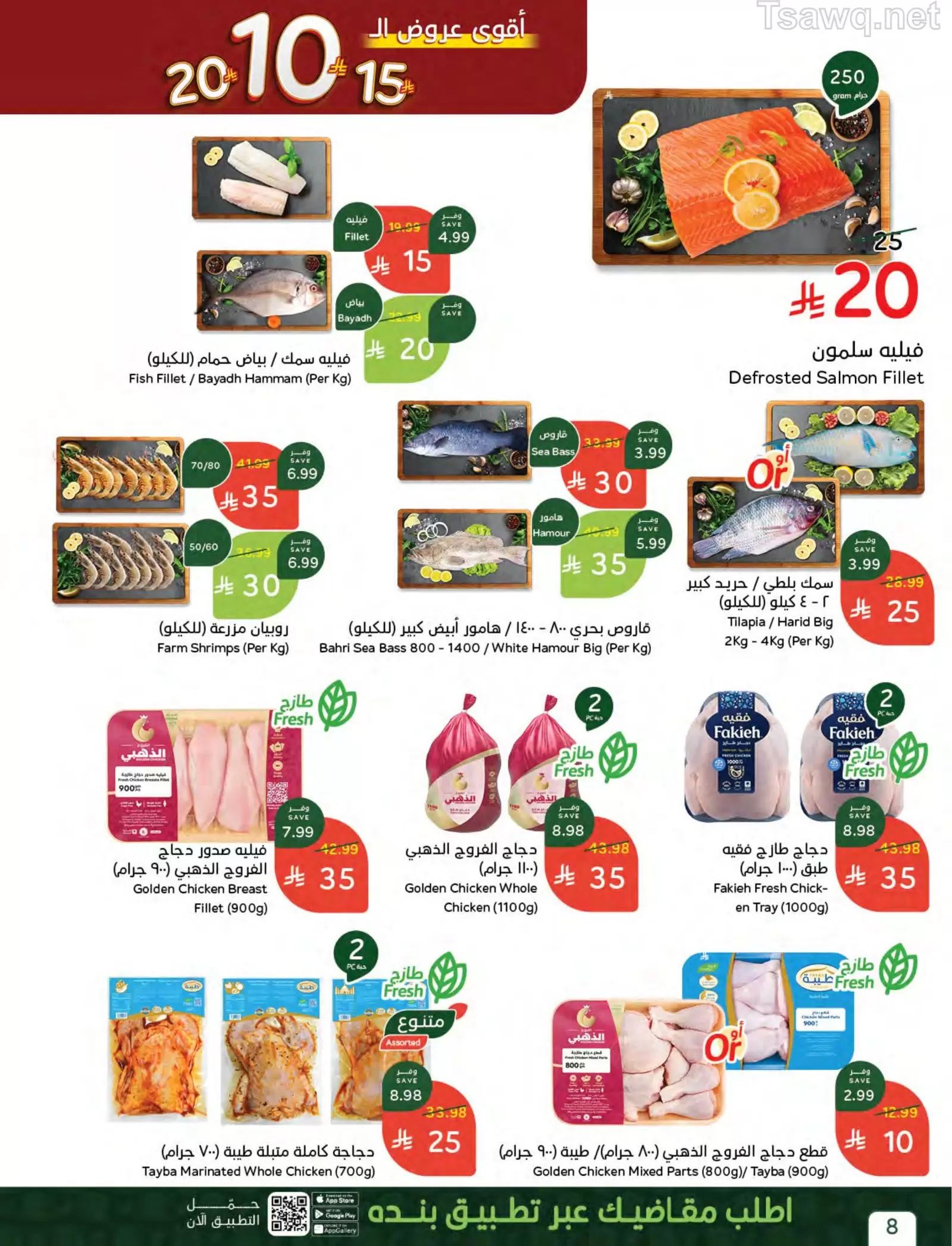 - الدجاج: دجاج الذهبي وفقه الطازج (1000 جرام) بـ 35 ريالاً للحبتين.