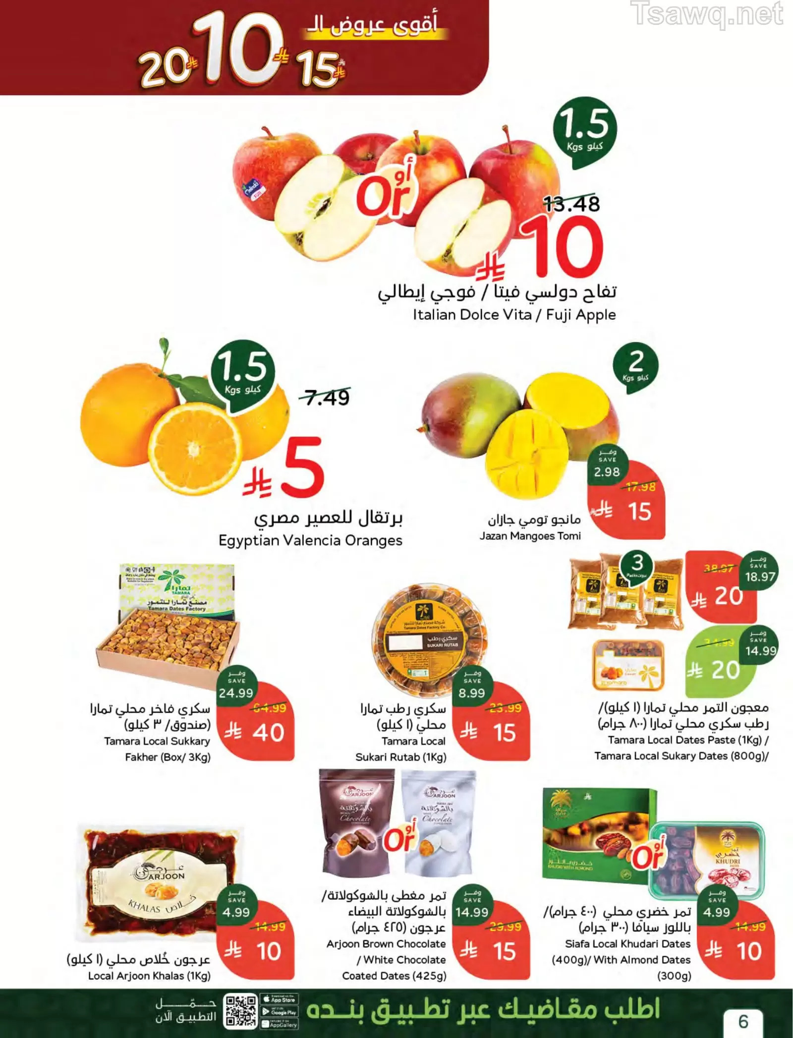 - الفواكه: تفاح دولسي فيتا أو فوجي إيطالي (1.5 كيلو) بـ 10 ريالات.