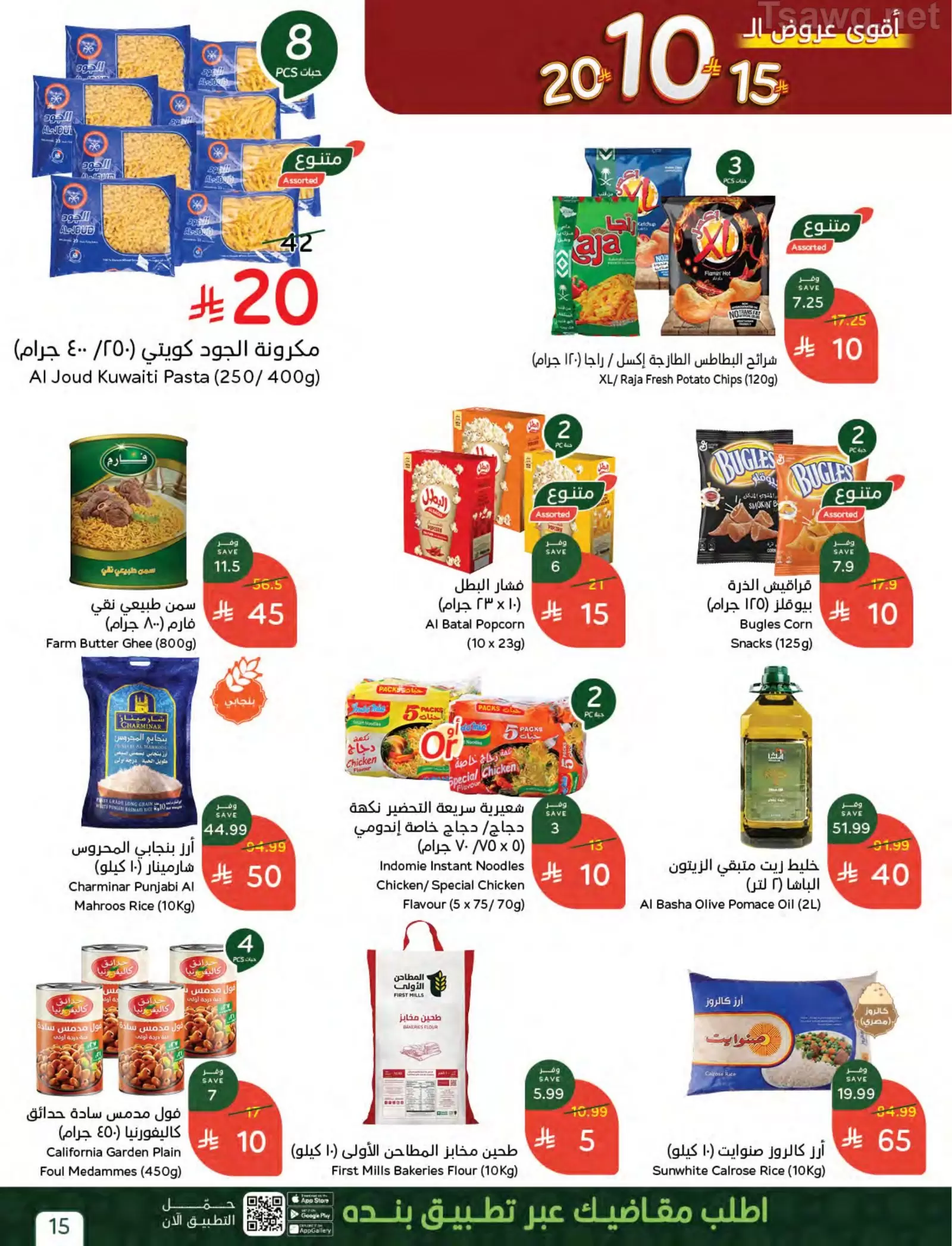 - الأرز والمكرونة: يتوفر أرز كالروز صنوايت (10 كيلو) بسعر مغرٍ (65 ريال)، بينما يمكنك الحصول على مكرونة الجود الكويتية أو مكرونة بنده بأسعار تبدأ من 5 و10 ريال فقط.