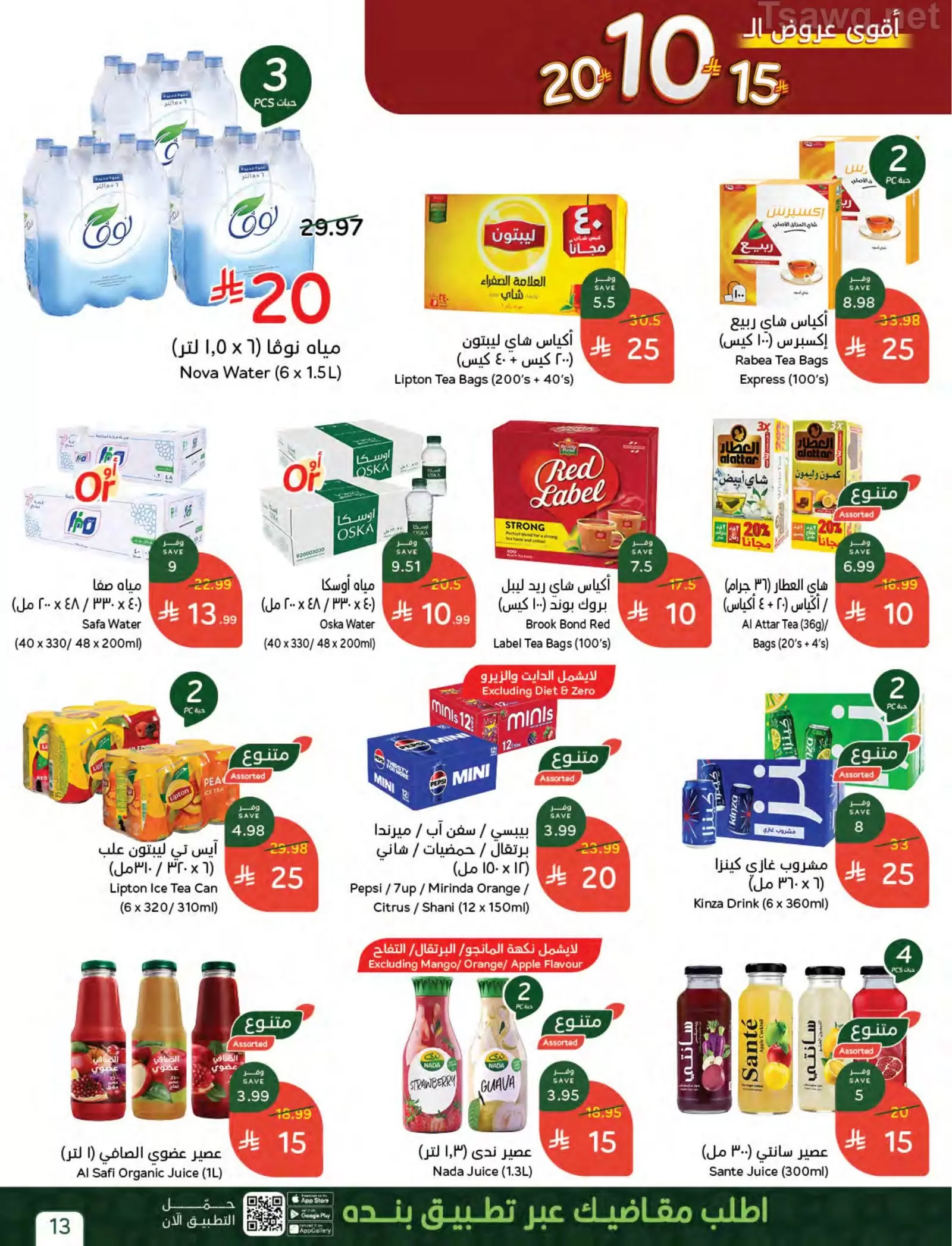 - المياه: مياه نوفا (6 × 1.5 لتر) بسعر 20 ريال لـ 3 ربطات، وعروض على مياه صفا وأوسكا بـ 13.99 ريال للكرتون.