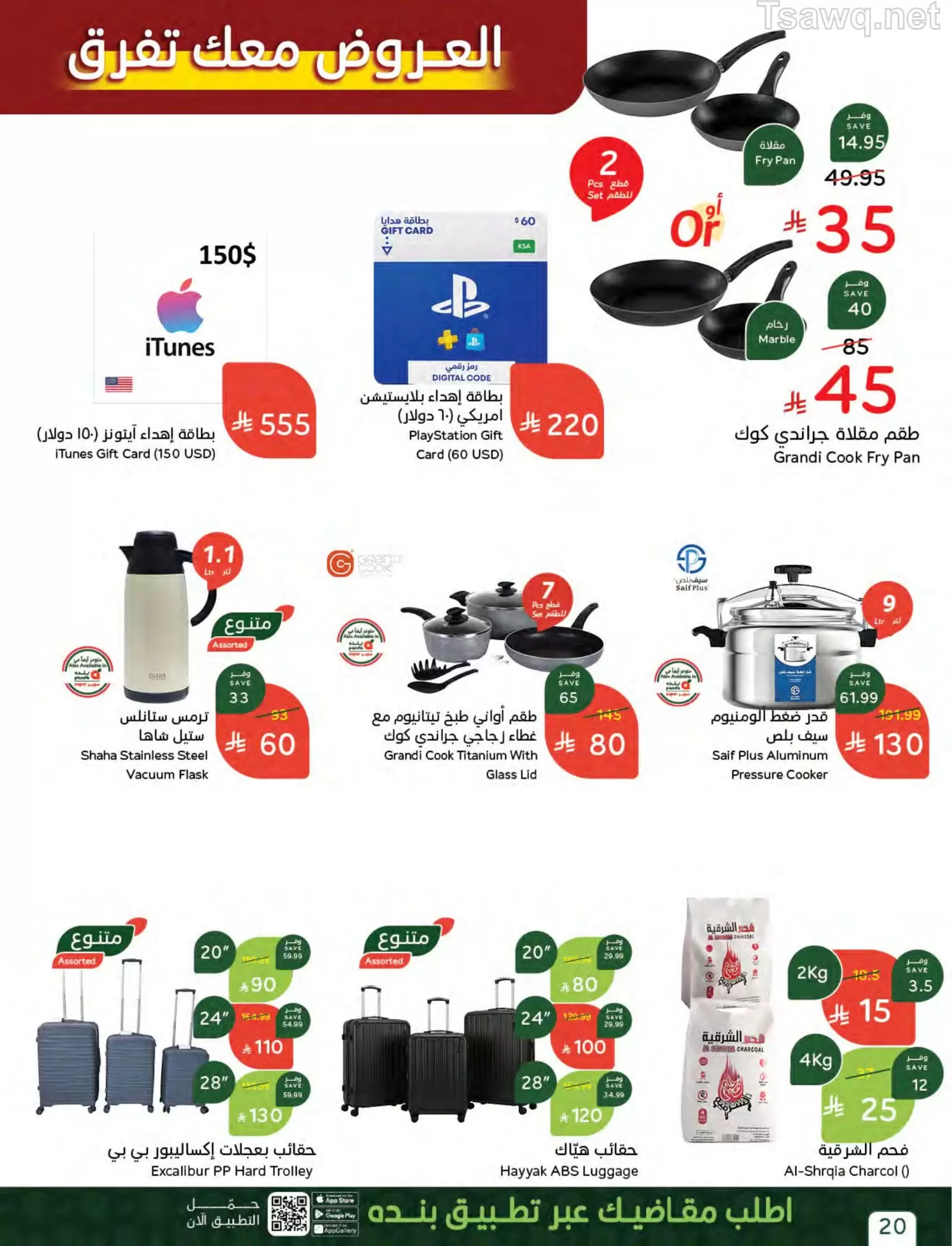 - أدوات الطبخ: طقم مقالي "جراندي كوك" بأسعار تبدأ من 35 ريال، وقدر ضغط سيف بلس (9 لتر) بسعر 130 ريال.