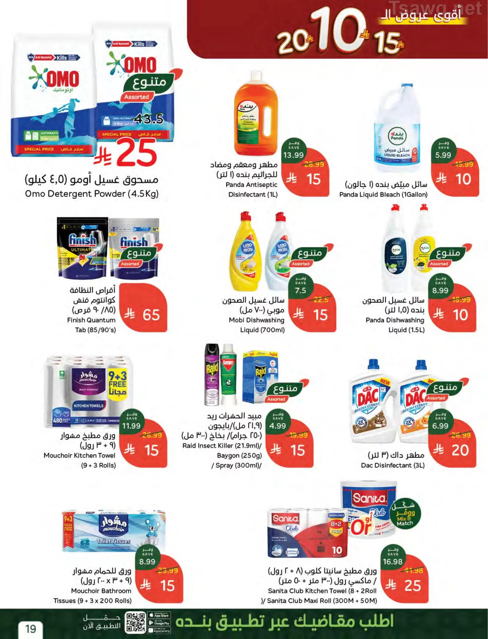 - المناديل: ورق مطبخ مشوار (9+3 رول) بسعر 15 ريال، ومناديل حمام بنده بـ 15 ريال.