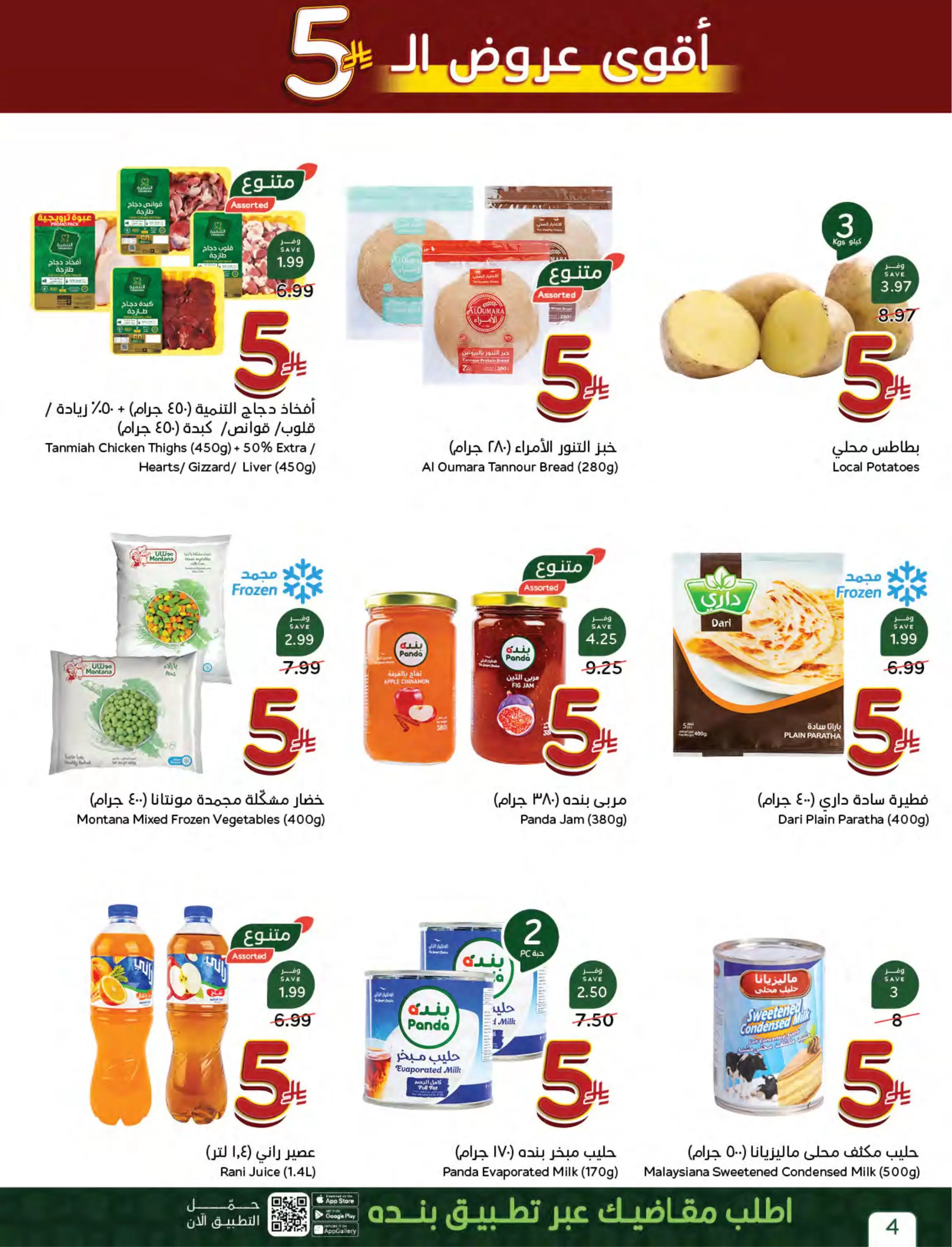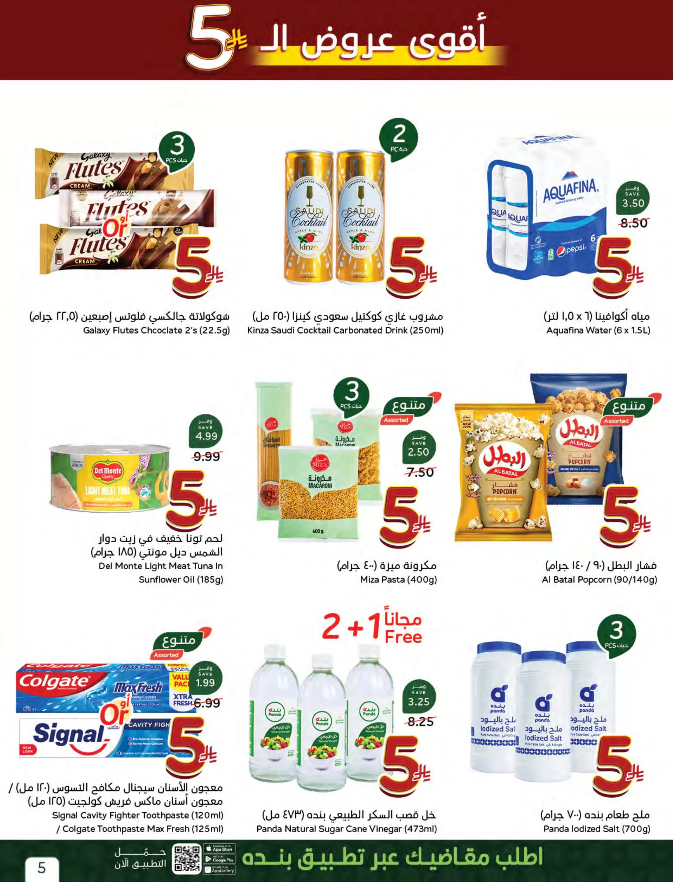إذا كنت تبحث عن تعبئة عربة تسوقك بأقل التكاليف، فإن قسم الـ 5 ريالات في بنده هو وجهتك الأولى. تشمل العروض: