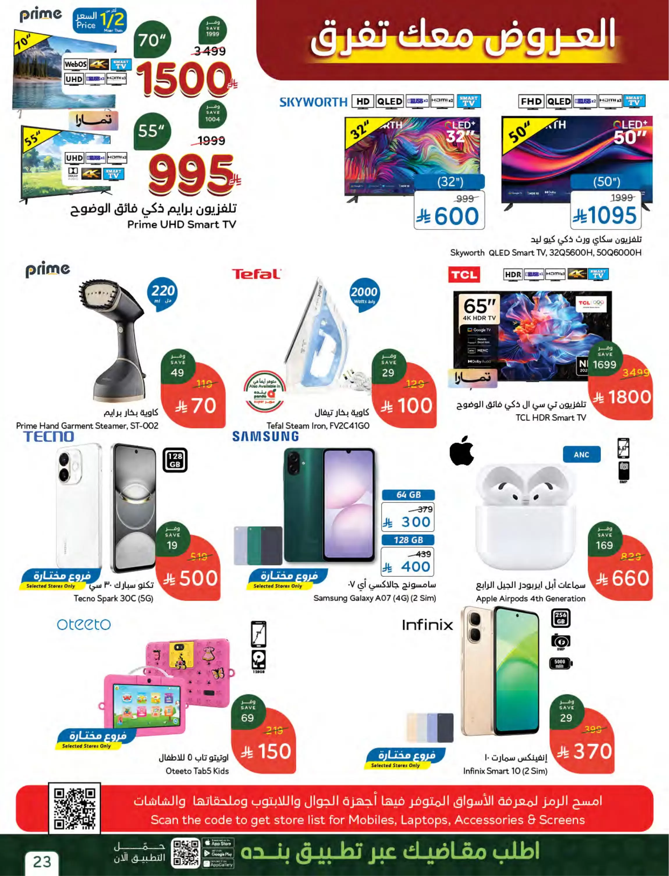 - الشاشات: شاشات Skyworth QLED الذكية تبدأ من 600 ريال لمقاس 32 بوصة، وتصل إلى شاشات TCL الضخمة 65 بوصة بـ 1800 ريال.