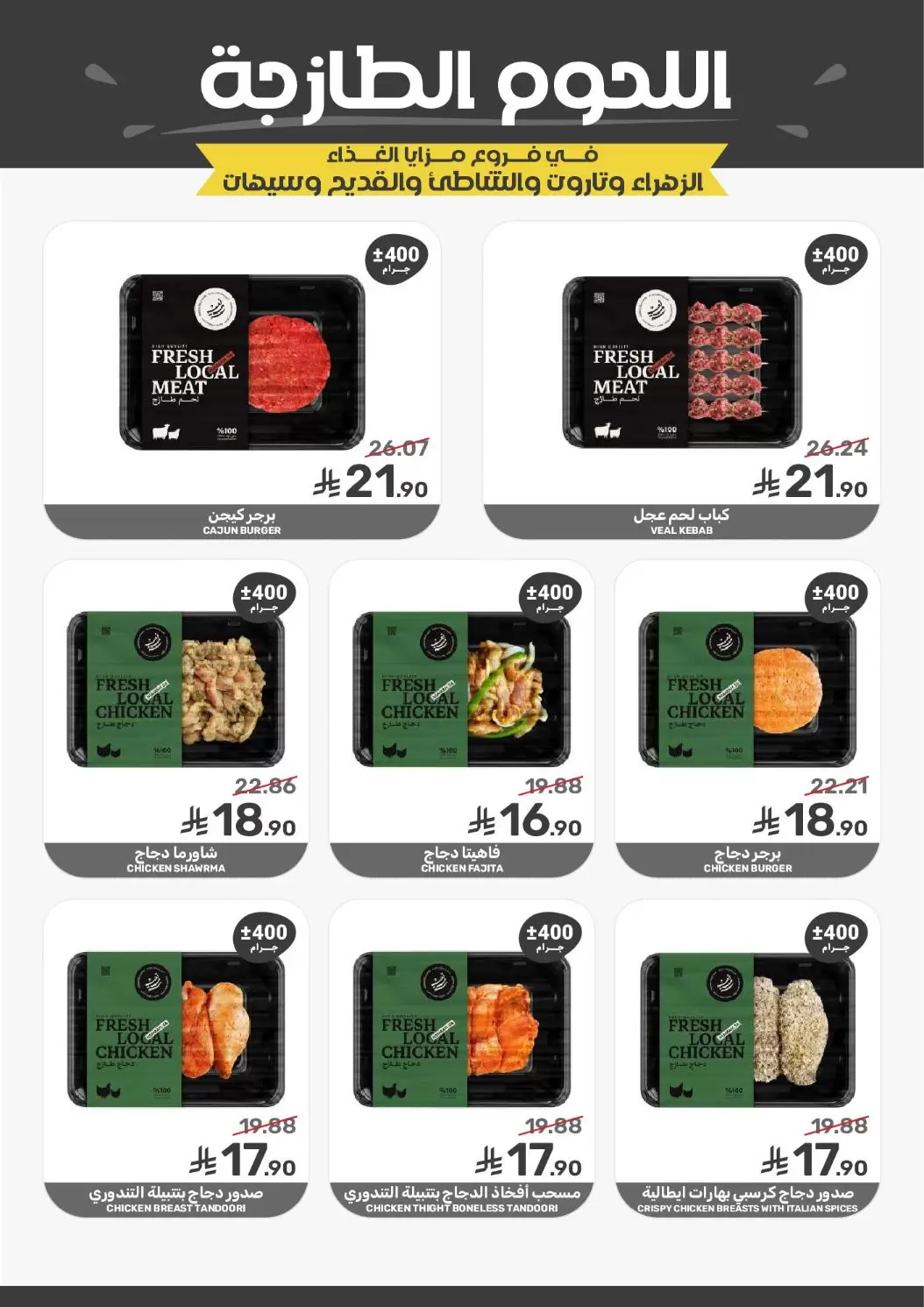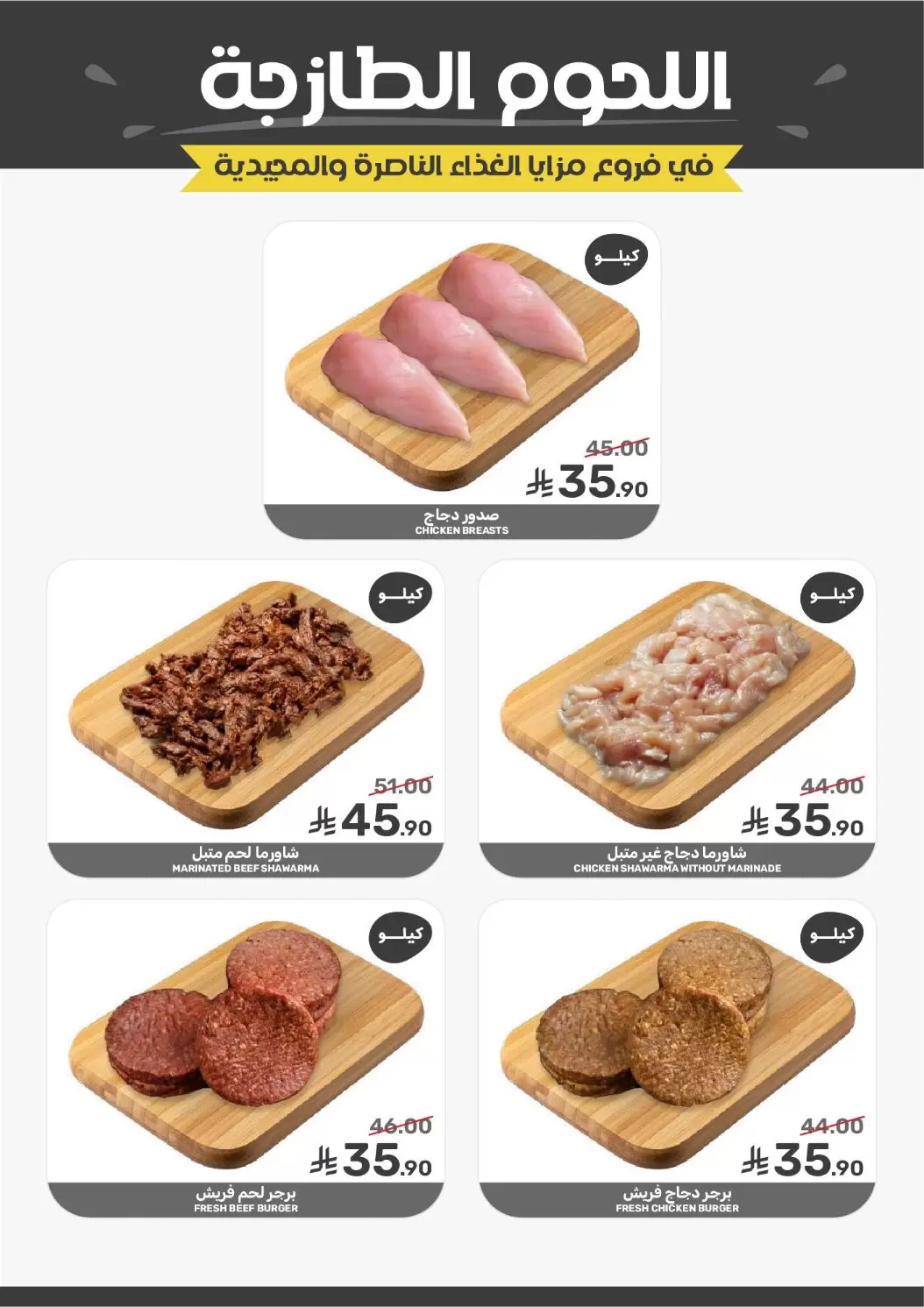 - برجر لحم/دجاج فريش: متوفر بسعر موحد 35.90 ريال للكيلو.