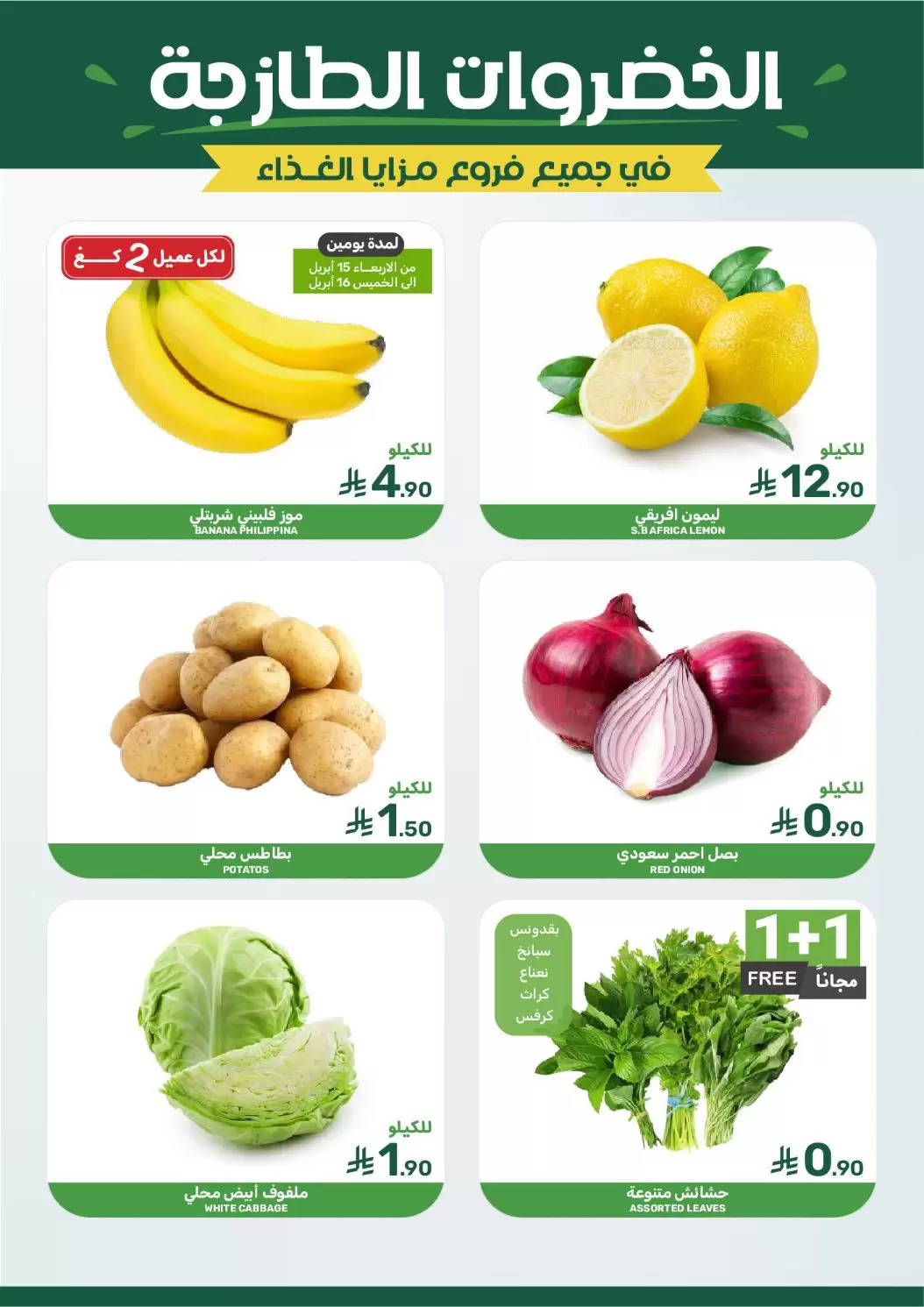 - عرض الحشائش (بقدونس، كزبرة، نعناع): اشتري 1+1 مجاناً بسعر 0.90 ريال.