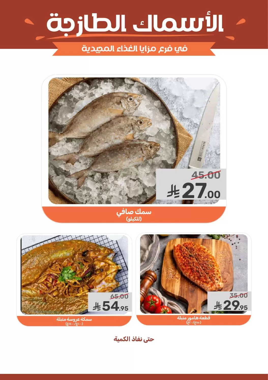 - سمك صافي (للكيلو): بسعر مذهل 27.00 ريال بدلاً من 45.00 ريال.